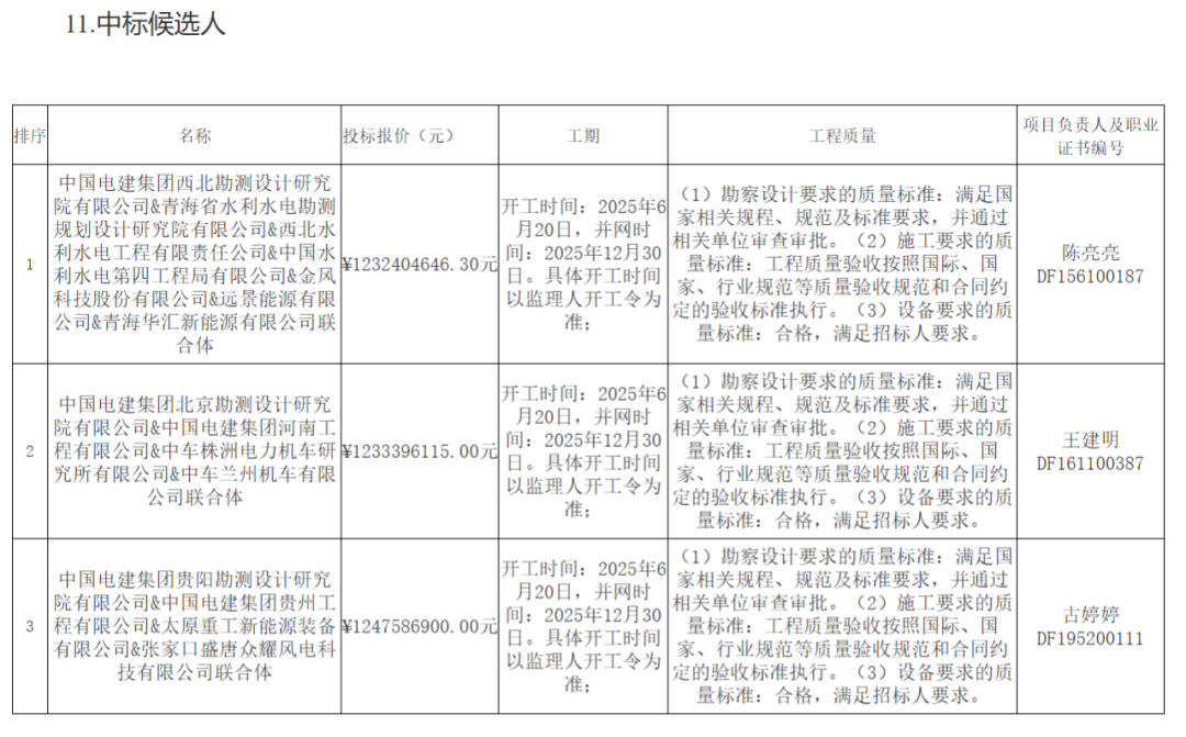 第三中标候选人:中国电建集团贵阳勘测设计研究院有限公司&中国电建集团贵州工程有限公司&太原重工新能源装备有限公司&张家口盛唐众耀风电科技有限公司联合体,投标报价:1247586900.00元。