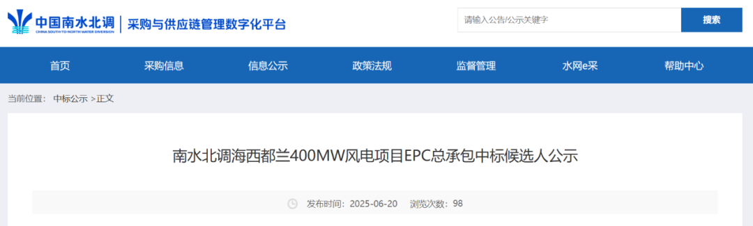 近日,中国南水北调集团采购与供应链管理数字化平台发布《南水北调海西都兰400MW风电项目EPC总承包中标候选人公示》的公告。